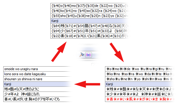 对音节(syllable),即每个被{\k__}划分的字符,进行代码操作,并将字符以单行的形式显示。